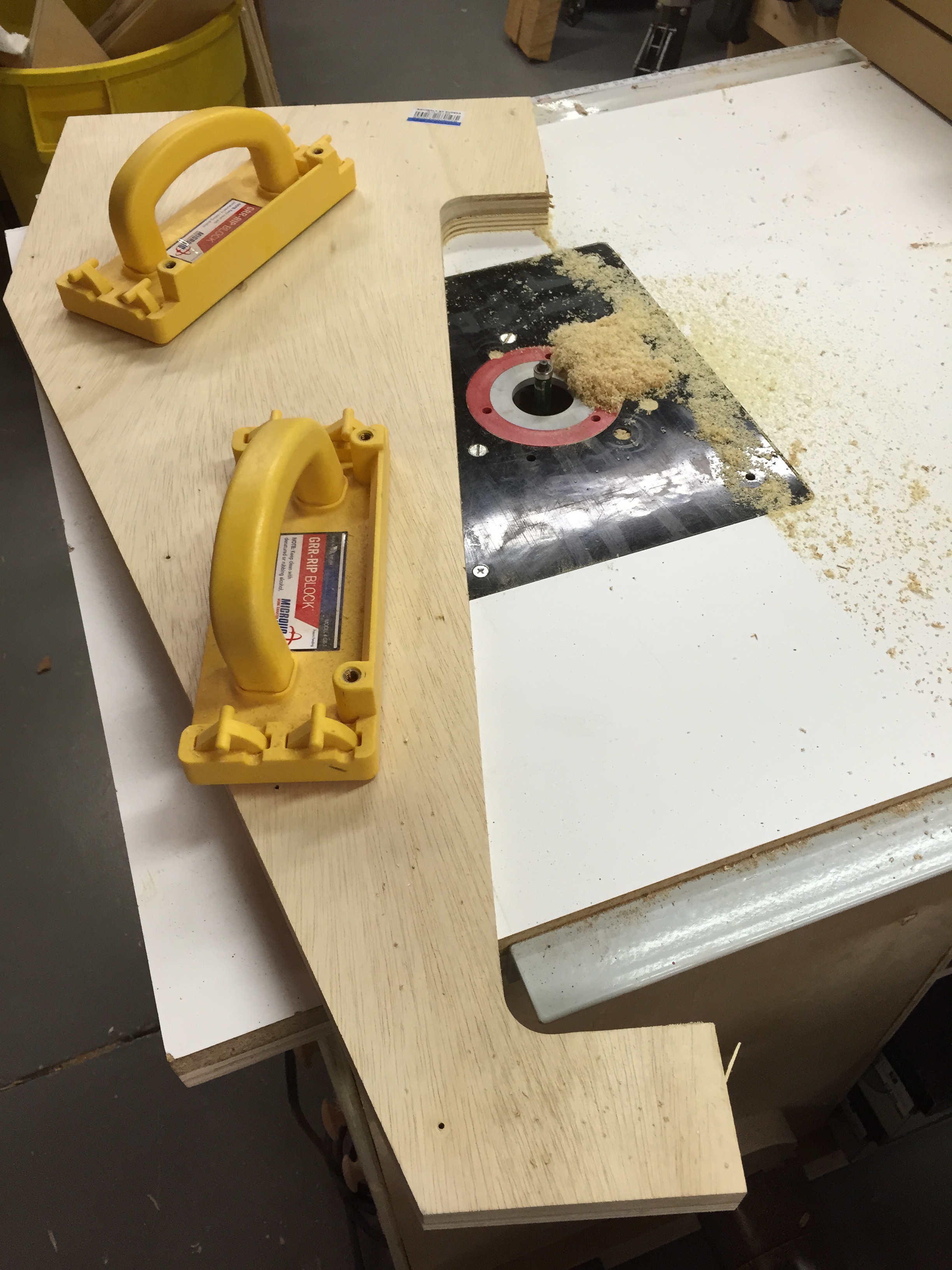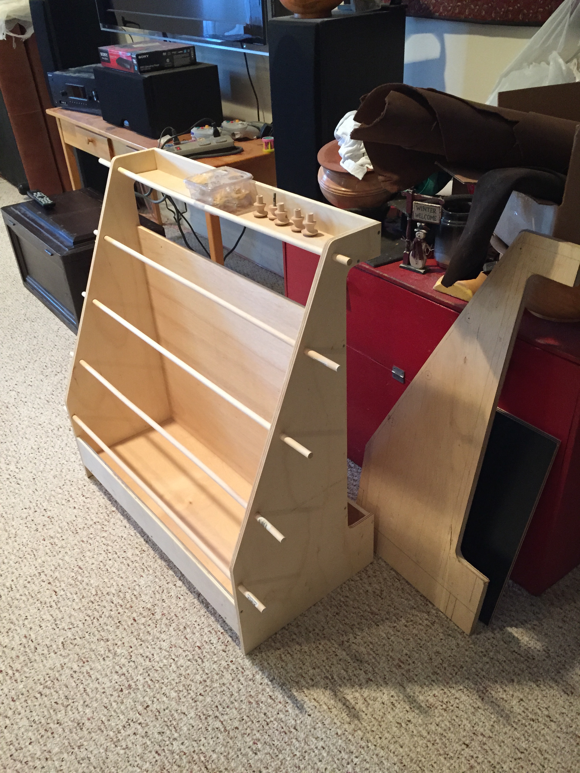 The bookshelf for the kindergarteners was assembled for my wife and daughter to size and sew the canvas shelf material. A template was created to trim the sides to shape. The drill holes in the template were used to align the larger holes that were used to fill with 1/2″ rods that will support the shelf fabric. Once we’re set, the rods will be trimmed flush to the sides and the drawer knobs will be screwed into both ends to hold the bars in place. (Well, they are kindergartners after all!) At that point, this unit will be finished with chalk paint. and that’s when I expect to get a request to either change design – or deliver more.