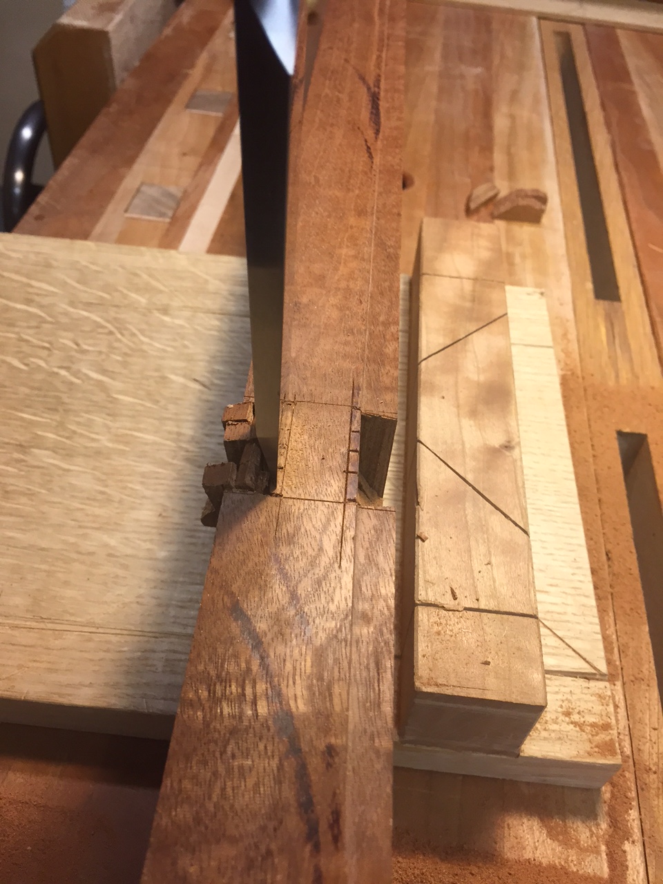 The edges of the tenon are trimmed with a saw (I used a dovetail saw, so it didn’t cut down 2 1/2″ – I had to chop and chisel the corner to clean it up.