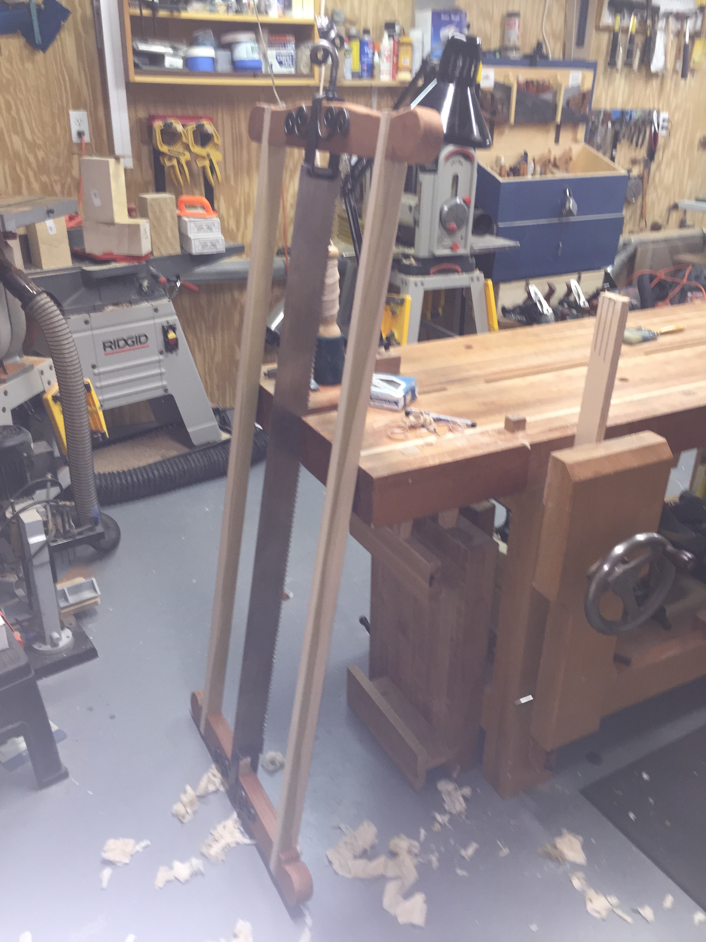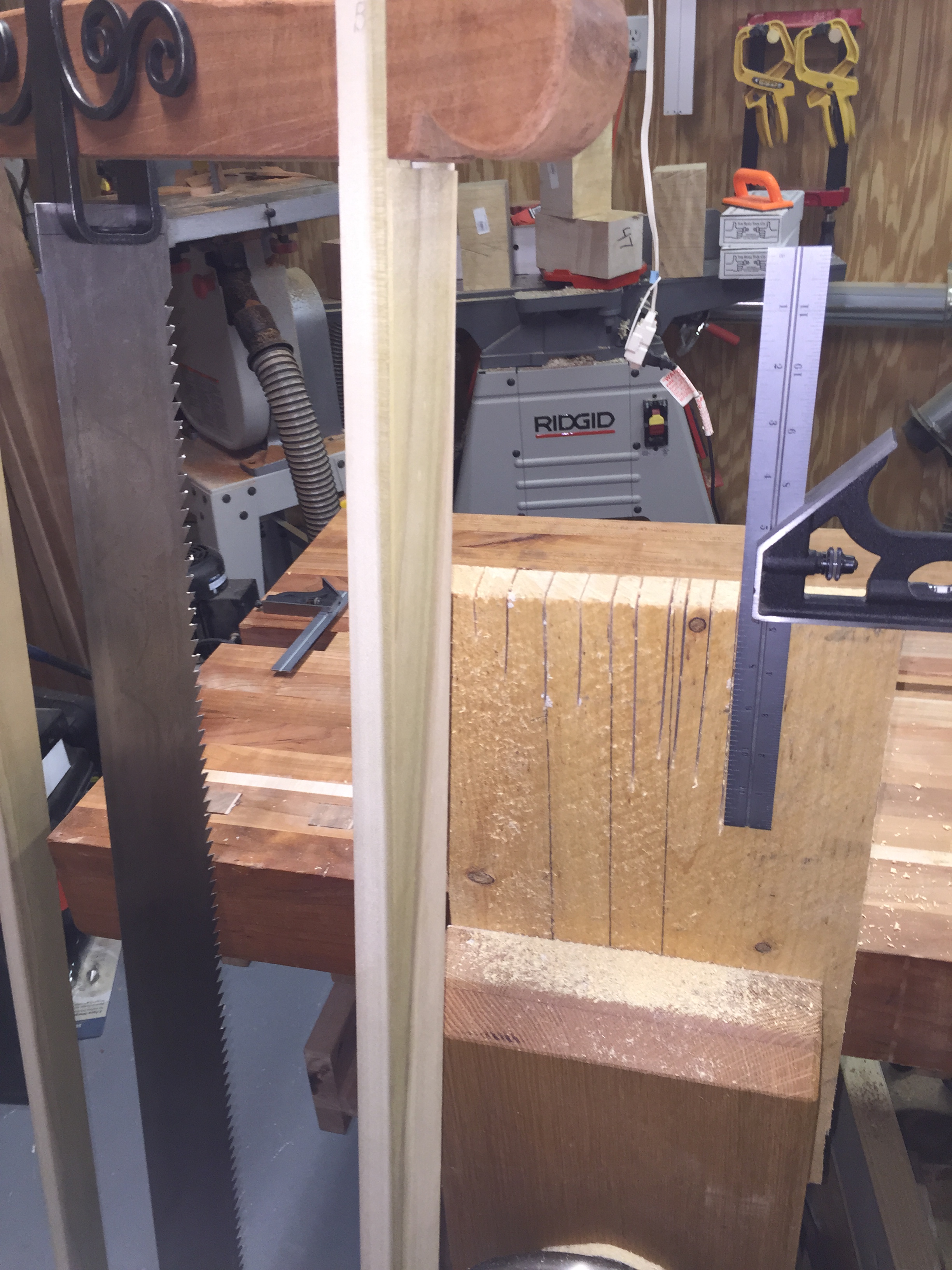 So a couple years back Shannon Rogers covered the creation of the Roubo style resaw frame saw in semester 4. And I purchased the metal and blades at that time and they’ve been moved around quite a bit since then. I recently got a spot between some projects, and decided to go ahead and do the Roubo style 4′ long, 4″ wide large saw to see how I can make do. I have lots of 8/4 cherry stock and my oldest daughter has asked for some wall units that would benefit from some book matched components. I figured since most of the stalk “could” be done on a bandsaw I’m covered if this doesn’t work out, but in the mean time it’s sure fun to try out these techniques. I’m pretty impressed to find out some manual operations are a lot faster than power tool operations – setup for hand tools is pretty easy sometimes, and sometimes a simple operation setup on the power tool is not.