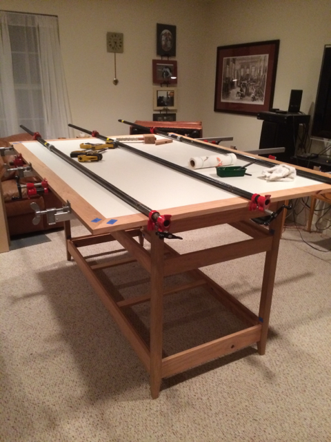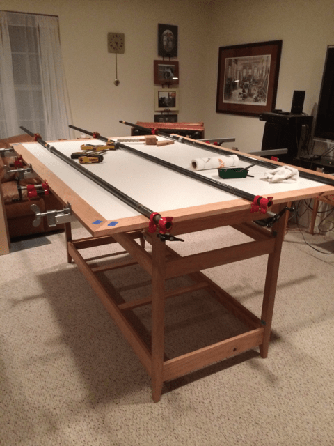 Sewing Room Cutting Table 15 ← Previous Next → The top is a chip board melamine banded with 3 1/2″ wide strips of cherry.