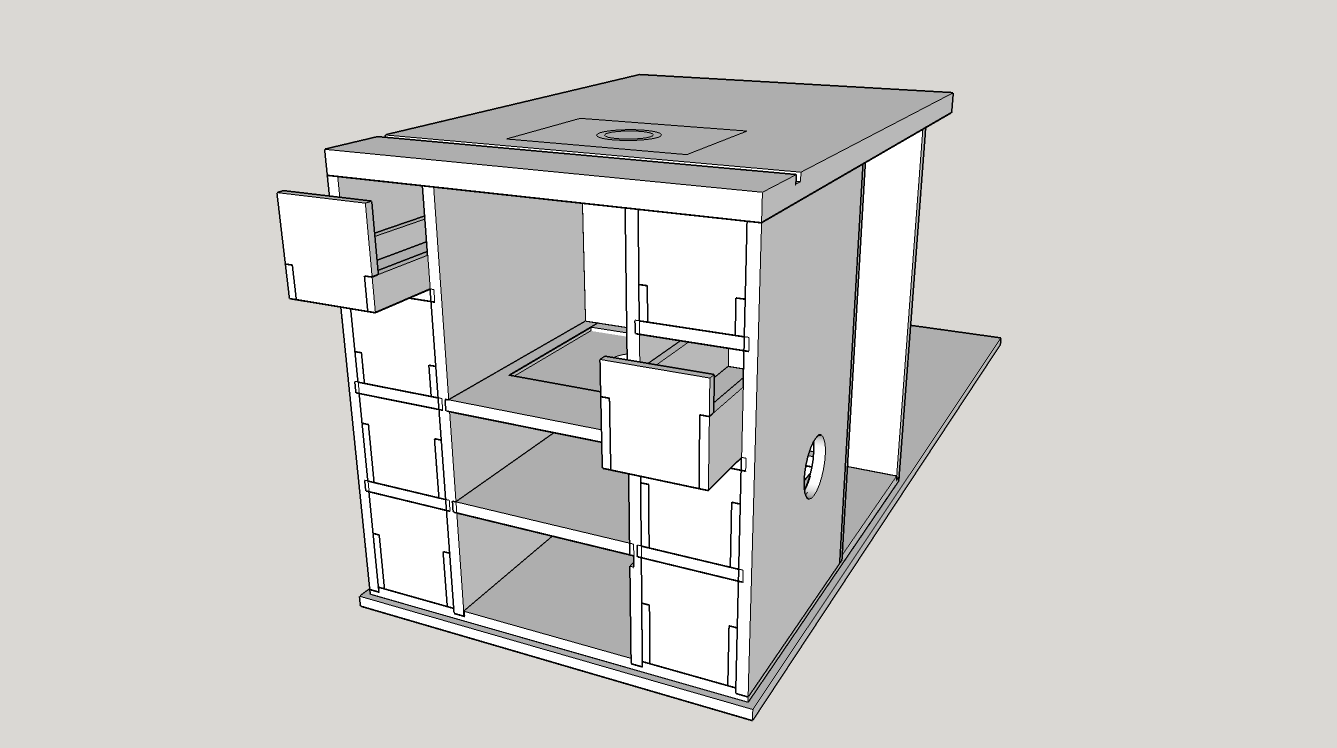 A rebuild plan for the router cabinet that makes up the tablesaw unit I have rolling around my shop. The original plan has single bottom shelf, and a baffled section for the router. The dust collection in the baffle section never worked well, and I really wanted to take advantage of the space more efficiently. Here’s the plan – in progress 🙂