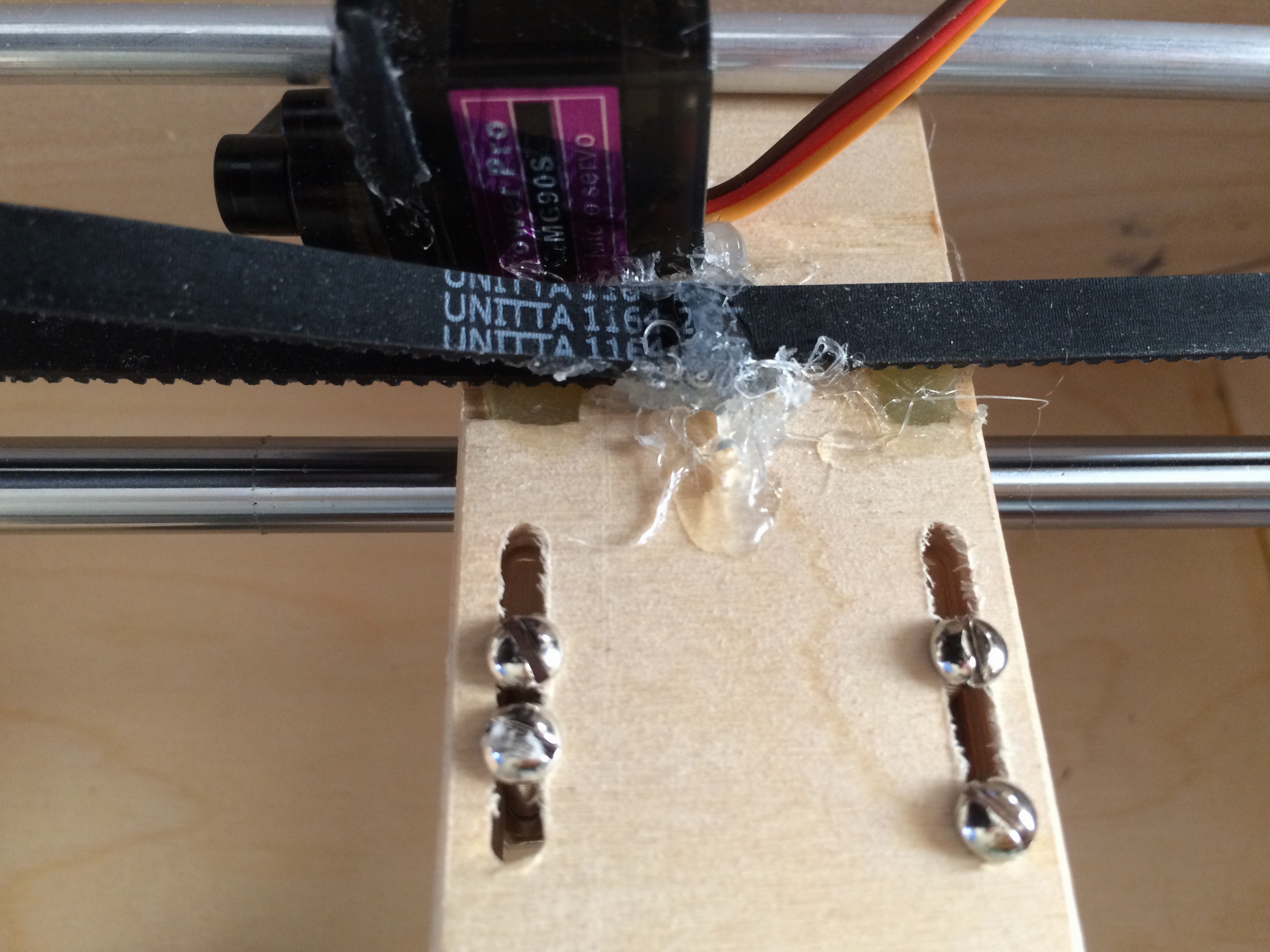 The timing belt get gets cut, and connected to create a fairly snug loop over and under the platform. For the intial exercise I simply hot glued the belt together, but for the actual implementation, I plan to create a splice using a small 1″ section of the belt with the teeth up, and overlay both ends of the looped belt 1/2″ (approx) with the teeth facing down, and meshing with the patch piece. And rather than glueing this, we will have a small cap piece that is screwed to the platform to pinch the splice together.